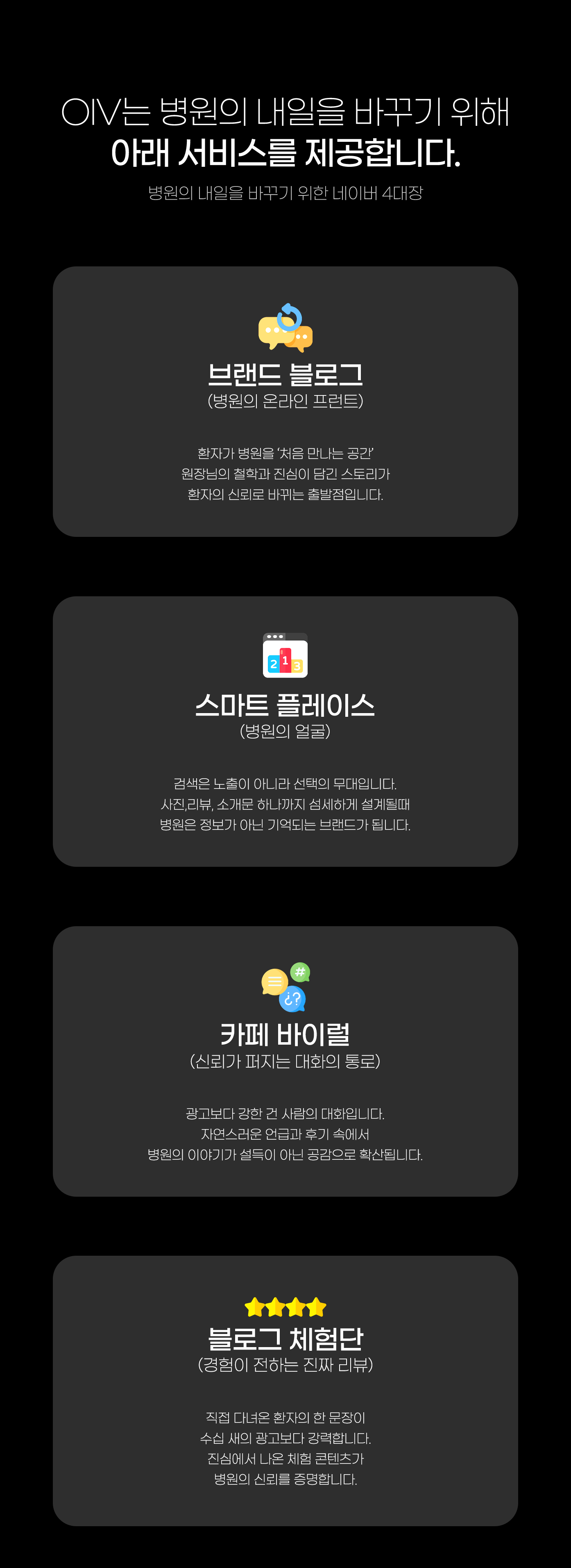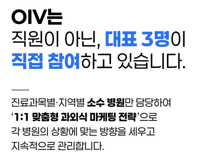 OIV는 단순히 ‘광고를 대행하는 회사’가 아닙니다. 마케팅이 하나의 흐름으로 연결되도록 설계하는 실행형 브랜딩 파트너입니다.